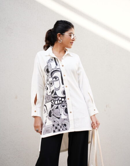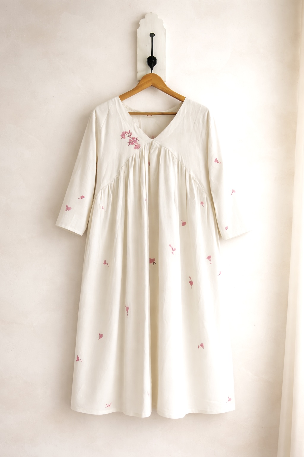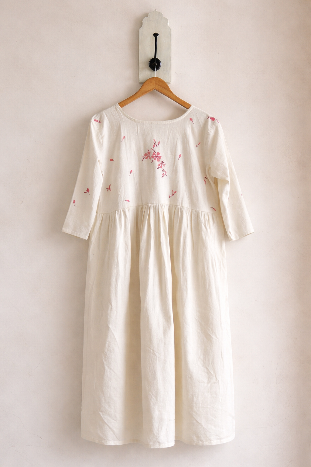 Crafted in 100% pure khadi cotton, this ivory dress embodies breathable comfort with a refined, handcrafted touch. The design features a graceful overlap (angrakha-style) yoke that gently gathers into a flowy, relaxed shape making it comfortable and easy to wear every day.