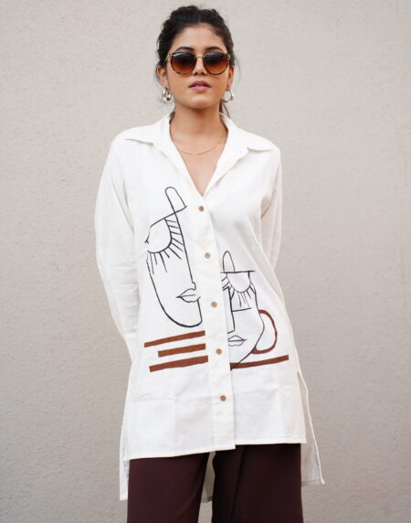 A statement handmade shirt crafted in pure Khadi cotton, featuring bold handpainted face art inspired by contemporary folk expression. Breathable, lightweight, and naturally textured, this shirt balances artistic character with everyday comfort. Each piece is hand-painted, making every shirt uniquely expressive and one of a kind.